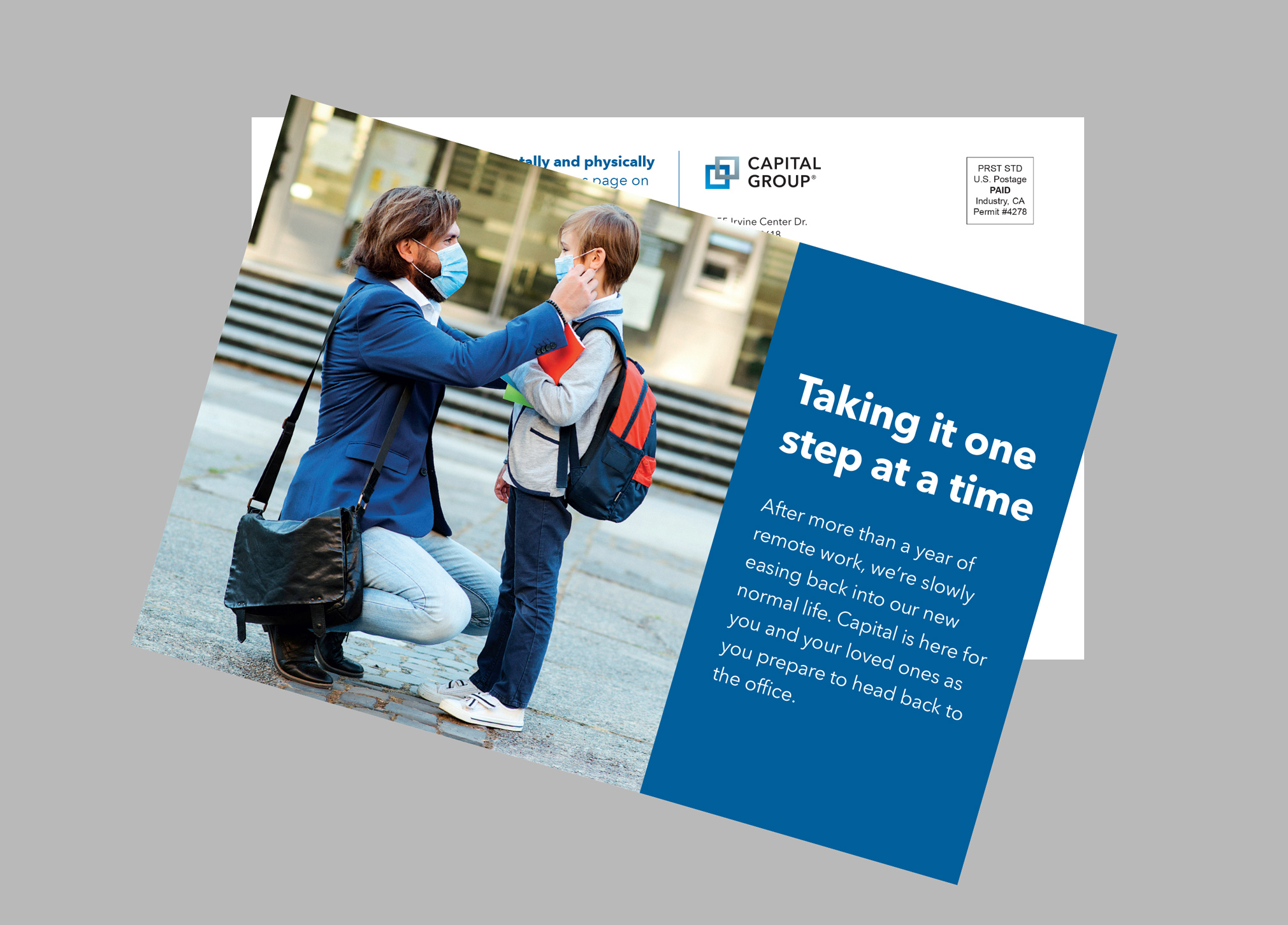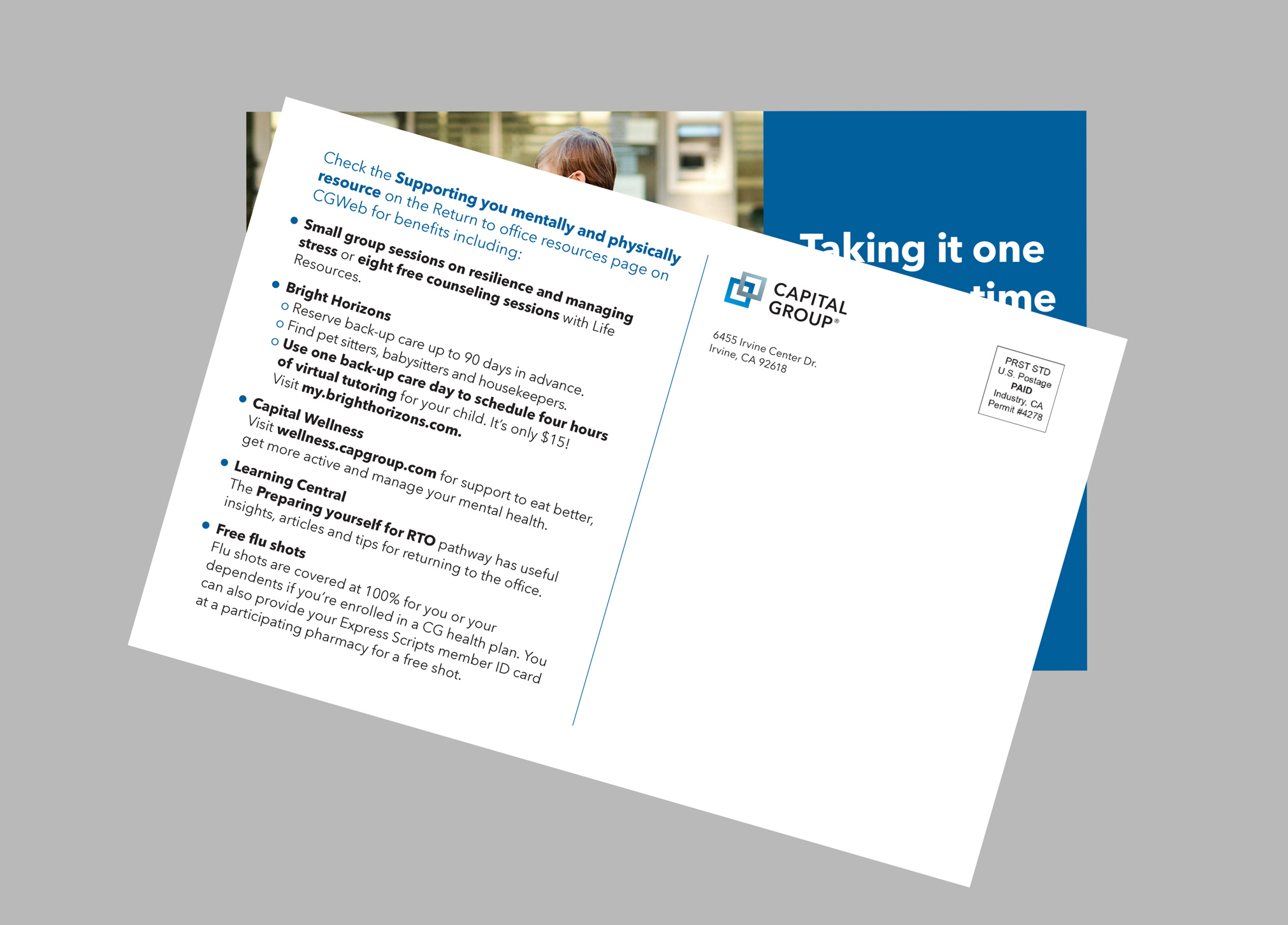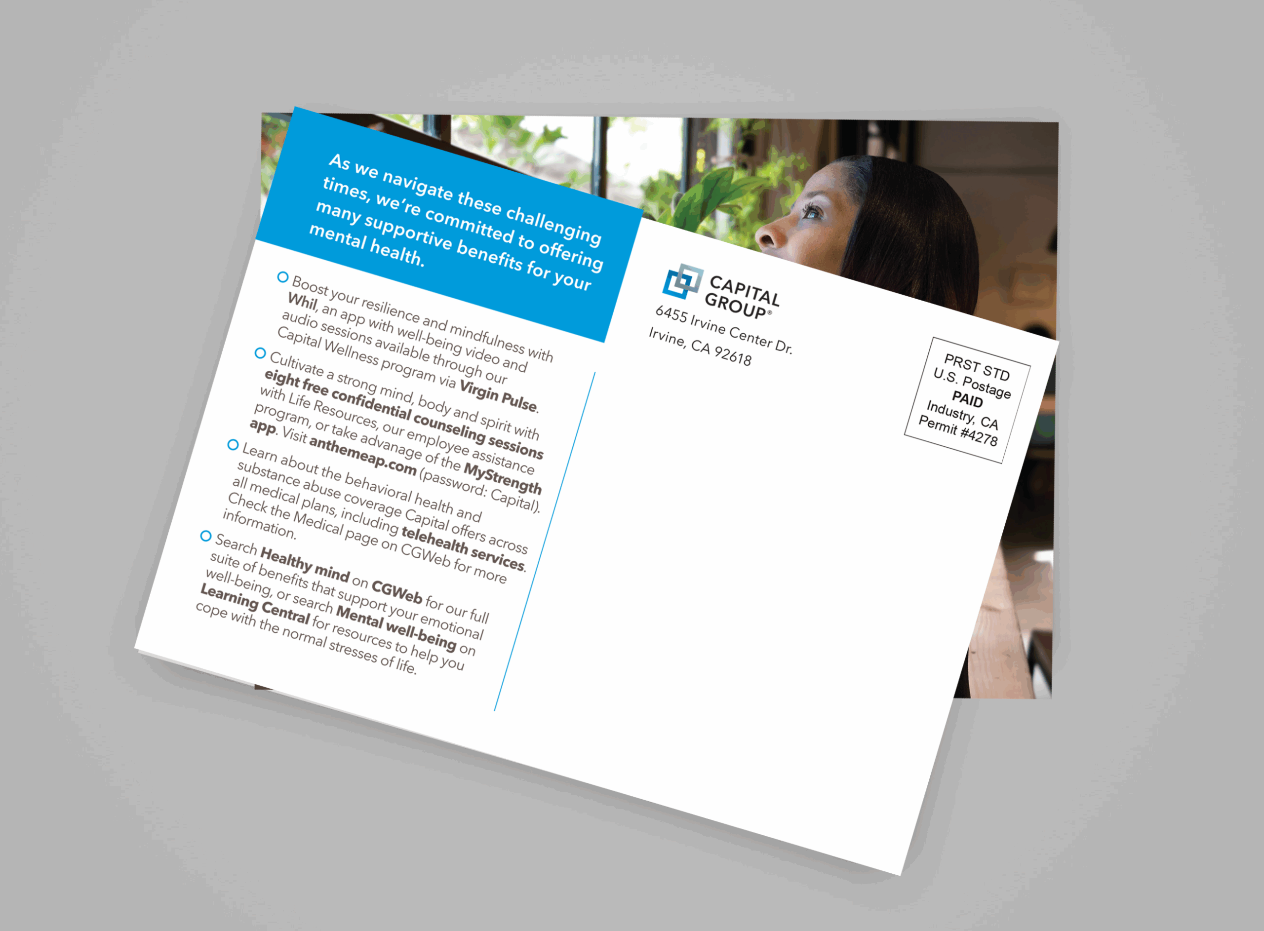 I designed two on brand postcards while at Capital Group, I worked with a communications engagement specialist, our benefits & hr business partners, and a print vendor to design and send the postcards to all US associates. For the first postcard I photographed the associate Shari and photoshopped her into a garden/cafeteria area. I used InDesign to place the design elements and text on to the post card.